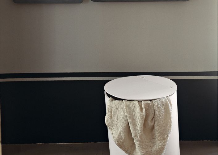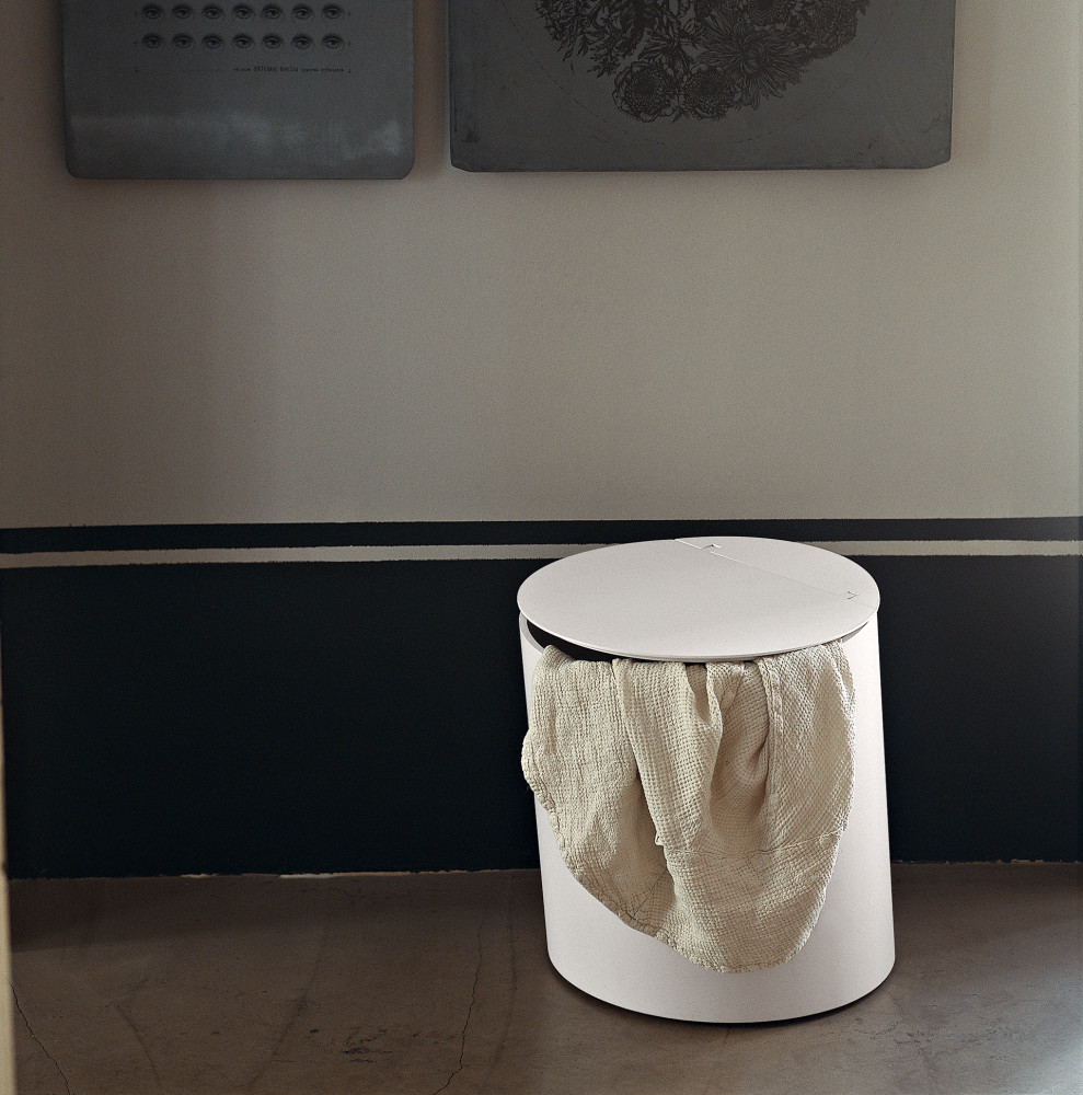 Basket ; Ein geräumiger, zylindrischer Behälter. Aus gebogenem Schichtholz mit natürlichen, braunen oder dunklen Eichefurnier, in Teakholz oder in einer weißen oder grauen matt lackierten Farbe erhältlich. Der Korbbehälter kann auch als Sitz verwendet werden. Löcher an den Seiten erleichtern das Bewegen, ohne dass der Deckel geöffnet werden muss.