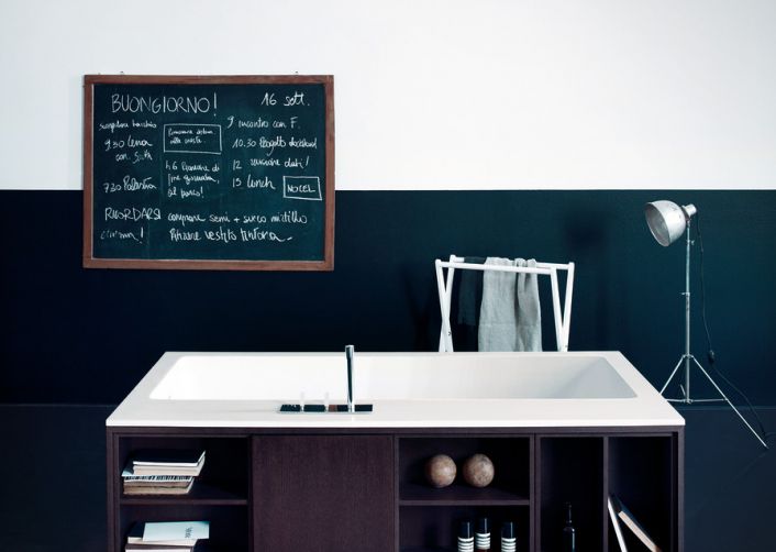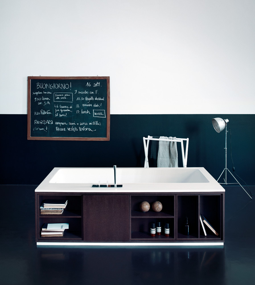 Freistehende rechteckige Badewanne innen aus weißem Cristalplant® biobasiert. Außen mit Regaleinsätzen verkleidet in Eiche Natur, mittel, dunkel oder Teakholz. Die Ablagefächer können mit Türen geschlossen oder offen gelassen werden. Es sind maximal 4 Boxen möglich. Das Modell AVAS0995 und AVAS0996 können auch mit interner Wasserversorgung ausgestattet werden.