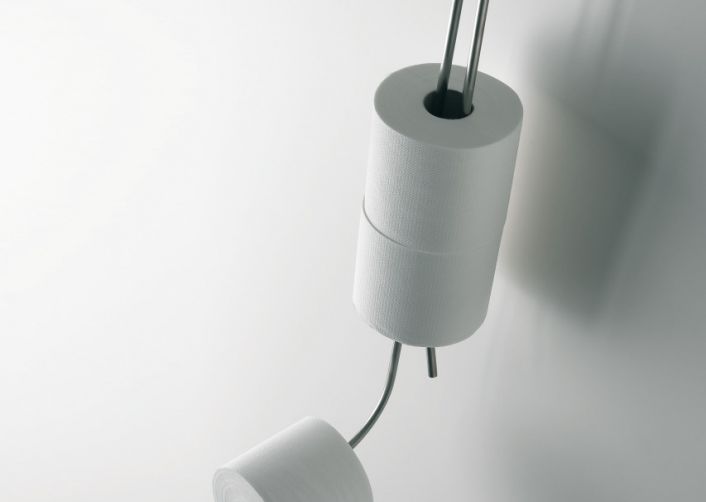 Toilettenpapierhalter aus satiniertem Edelstahl, hergestellt aus einem geformten, rohrförmigen Element (10 mm - 3/8 "). Der Halter wird an der Wand mittels einer Halterung befestigt, aus der er herausgezogen werden kann. Die Toilettenrollen bleiben sichtbar.