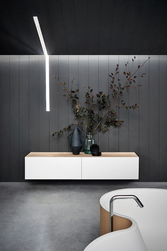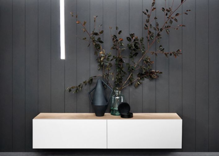 Lato ist ein Programm, das sich aus mehreren Möglichkeiten der Aufbewahrung zusammensetzt, die durch viele Abmessungen und unterschiedliche Frontverkleidungen gekennzeichnet sind. Die Schrank Korpen sind aus funierter Eiche oder in rekonstituiertem Holz mit Teakholz oder in weißer, grauer oder in RAL-Farbstoffen lackiert. Die Vorderseite der Schubladen sind aus Eichen- oder Teakholzfurnier, lackiert oder aus Leder, Marmor oder Glas. Die Waschbecken können direkt auf das Schrankmodul H cm 40 (15 "3/4) ohne Notwendigkeit einer Oberseite positioniert werden. Die Möbel können auch mit der Ell-Waschtischplatte kombiniert werden