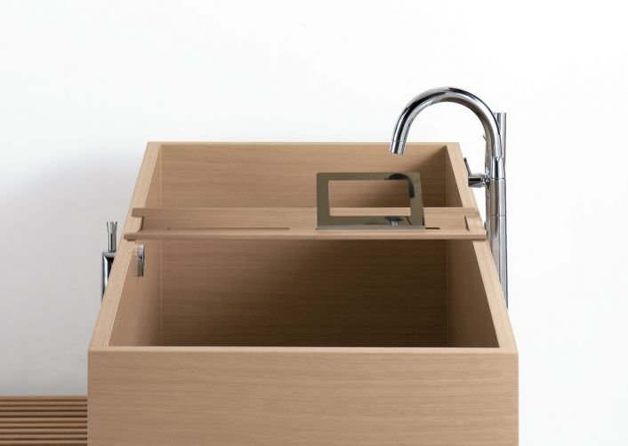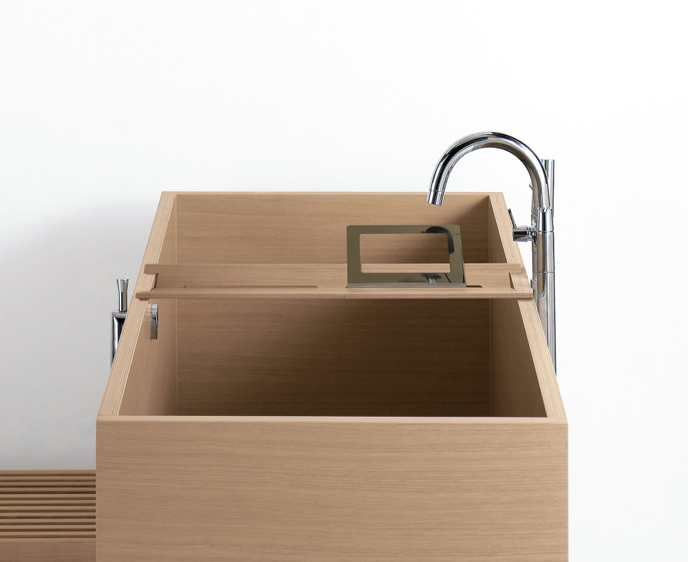 Bathtub tray designed to fit the Woodline and Woodline V bathtubs, it rests on the sides of the tub by means of two grooves carved into the wood. The design is inspired by that of a book stand, where objects resting on the inclined plane are retained by the lower edge. Made from waterproof birch plywood with light, medium or dark oak veneer, it is fitted with a stainless steel support which serves as a book stand.Stellen Sie eine Anfrage zu diesem Produkt