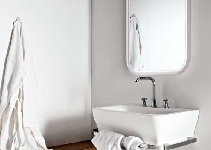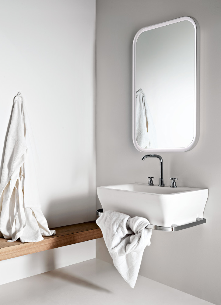 Eine Kollektion, die die Atmosphären des Bades des vergangenen Jahrhunderts neu interpretiert. Der Waschtisch aus weißem Cristalplant® biobasiert oder zweifarbig (Außenteil hellgrau oder dunkelgrau), mit seinen eleganten Linien und bedeutenden Proportionen, ist der Star eines Raumes, der ganz dem Wohlbefinden und der Raffinesse gewidmet ist. Der integrierte Handtuchhalter sorgt für zusätzlichen Komfort.