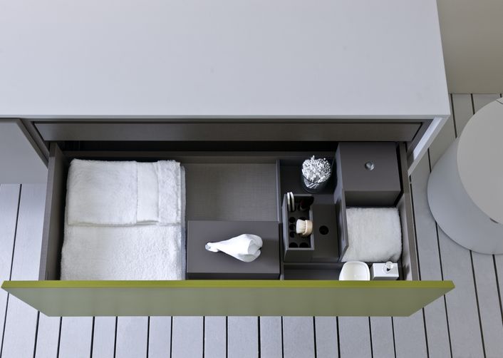 Sortiment für Stauraum entworfen von Benedini Associati. Das Hauptmerkmal der Reihe ist die modulare Art der Einheiten, die auf Anfrage nach Maß gefertigt werden können. Das Sortiment umfasst Waschtischplatten aus Exmar, Holz oder Cristalplant® biobasiert, unterstützt von Unterschränken deren obere Kante so gestaltet ist, dass sie geöffnet werden kann. Ein Waschtisch, bestehend aus einer einteiligen Arbeitsplatte aus weißem Exmar, die von Wand-Aufbewahrungseinheiten mit Seiten aus demselben Material oder ohne Seiten für vertiefte Konfigurationen getragen wird. Eine minimalistische Lösung, die maßgeschneidert werden kann, um perfekt in jeden Raum zu passen.