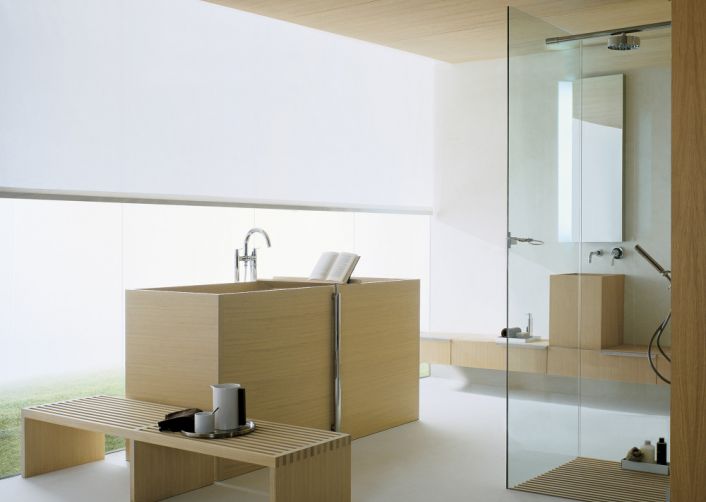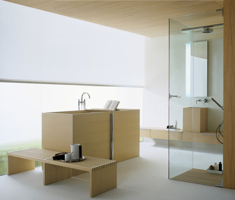 The bathtub, designed as a complement to the Woodline range, extends upwards, creating a sauna-like enclosure, which allows two users to sit in an almost vertical position, opposite each other. Made from waterproof birch plywood with light, medium or dark oak veneer. For easy access to the bathtub, benches in light, medium or dark oak veneer, can be placed next to it. These can also be fitted with Flat XL units with drawer, in the respective finishes.Stellen Sie eine Anfrage zu diesem Produkt